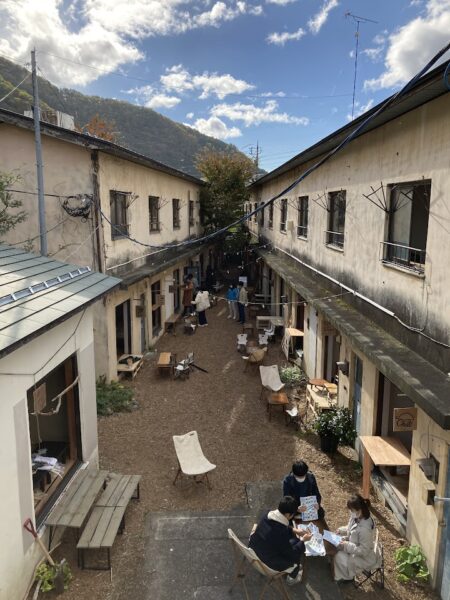 土色の外壁をした2棟の長屋がハの字型の配置で建っている。温泉街の裏側にある魅力的な廃墟に目を付けた東大生たちが作り上げたイベントです。